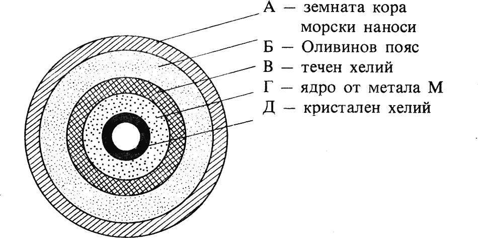 Земното ядро представлява кухо кълбо или бомба от метала М, напълнена с хелий, който поради чудовищното налягане е в кристално състояние.