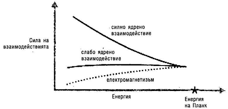 През последните петдесет години всички опити за създаване на едно наистина обединено описание на вселената се проваляха с гръм и трясък. Това не е трудно за разбиране от концептуална гледна точка. Общата теория на относителността и квантовата теория са диаметрално противоположни в почти всяко отношение. Общата теория на относителността е теорията за много големите обекти — черни дупки, големи взривове, квазари и разширяващи се вселени. Тя се основава на математиката на гладките повърхности, както чаршафите лягат върху матрака. Квантовата теория е точно обратното — тя описва света на невъобразимо малкото — атоми, протони, неутрони и кварки. Тя се основава на идеята за дискретни порции енергии, наречени кванти. За разлика от теорията на относителността, според квантовата теория могат да се изчислят единствено вероятностите за събитията и затова никога не можем да бъдем абсолютно сигурни къде точно се намира електронът. Двете теории се основават на различни видове математика, различни изходни постановки, различни физични принципи и различни области. Нищо чудно, че всички опити за обединяването им се провалят.