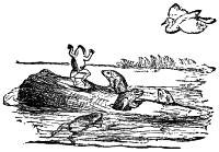 Жабите, недоволни, че си нямат владетел, изпратили посланици при Юпитер да молят за цар. Като ги виждал колко са наивни, той хвърлил един грамаден дънер в езерото. Жабите били ужасени от плясъка, предизвикан от падането му, и се скрили във водните дълбини. Но щом осъзнали, че огромният дънер не помръдва, те отново заплували към повърхността на водата, пропъдили страха си, покачили се и наклякали върху него с пренебрежение. След известно време те започнали да се чувстват онеправдани, че са им сложили такъв бездеен владетел и изпратили втора делегация при Юпитер да го молят да им изпрати друг монарх. Юпитер, недоволен от непрестанните им оплаквания, изпратил една чапла, която преследвала жабите ден подир ден, докато не останала нито една да квака в езерото.