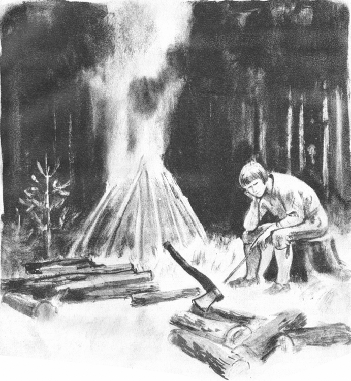 След вечерята домакинята и дъщерите й седнали да предат около голямата светеща борина, която момците поддържали с най-хубавата елхова смола. Дядото, гостът и хазаинът пушели и гледали как работят жените, а момците дялали лъжици и вилици от дърво. Навън виела виелица и шибала елхите. Тук-таме се чували силни удари и на дърварите често им се струвало, като че ли цели дървета се прекършват и се сгромолясват. Смелите момчета искали да изтичат към гората, за да наблюдават страшната, но красива картина, но дядо им ги спрял със строги думи и поглед.