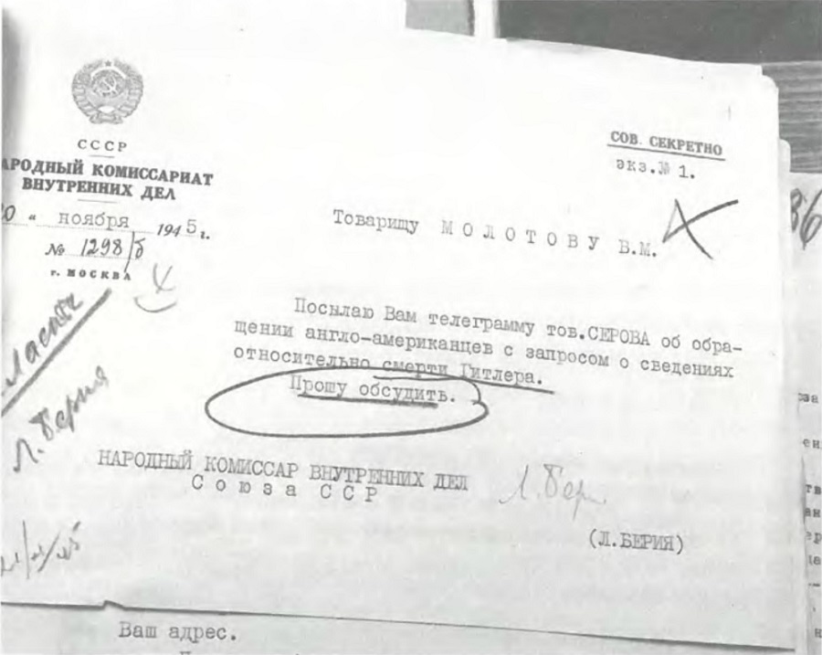 На 16 юни 1945 г. НКВД на СССР под №702/b ви представи получените от Берлин от др. СЕРОВ копия на протоколи от разпитите на обкръжението на Хитлер и Гьобелс относно последните дни от пребиваването на Хитлер и Гьобелс в Берлин, както и копия от описанието и от актовете от съдебномедицинското изследване на предполагаемите трупове на Хитлер и Гьобелс и техните жени.