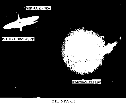Но как да очакваме да открием черна дупка, след като по дефиниция тя не излъчва никаква светлина? Може да ви се стори, че е все едно да търсим черна котка в мазе с въглища. За щастие, начин има. Както Джон Мичъл бе отбелязал в своята пионерска работа от 1783 г., черната дупка продължава да упражнява гравитационно действие върху съседните й обекти. Астрономите са наблюдавали много системи, в които две звезди обикалят една около друга, привличани помежду си от гравитацията. Освен това те наблюдават и системи, в които има само една видима звезда, обикаляща около някакъв невидим спътник. Разбира се, не можем веднага да решим, че спътникът е черна дупка: той може просто да е звезда, твърде слаба, за да е видима. Някои от тези системи обаче, като наречената Лебед Х-1 (фиг. 6.2) са освен това силни източници на рентгенови лъчи. Най-доброто обяснение за това явление е, че от повърхността на видимата звезда се отнася материя. С падането си към невидимия спътник тя има спирално движение (подобно на вода, изтичаща от вана), става много гореща и започва да излъчва рентгенови лъчи (фиг. 6.3). За да работи този механизъм, невидимият обект трябва да е много малък, например да е бяло джудже, неутронна звезда или черна дупка. От наблюдаваната орбита на видимата звезда може да се определи най-ниската възможна маса на невидимия обект. В случая с Лебед Х-1 тя е около 6 пъти масата на Слънцето, която според резултата на Чандрасекар е твърде голяма, за да може видимият обект да е бяло джудже. Масата е твърде голяма и за неутронна звезда. Оттук следва, че вероятно е черна дупка.